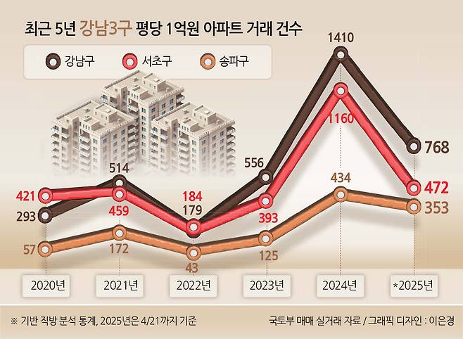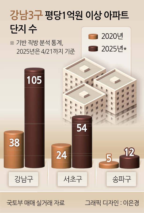 헤럴드경제가 직방에 의뢰해 국토교통부 실거래가 자료를 분석한 결과에 따르면, ‘평당 1억원’에 매매된 아파트 단지 수(4월 21일 기준) 강남3구(강남·서초·송파구)에서만 171개 단지로 집계됐다. 5년 전인 2020년(67개 단지)보다 2.5배 가까이 급증한 숫자다. 5년 동안 강남구는 평당 1억원을 넘긴 아파트 단지가 38곳에서 105곳으로 서초구는 24곳에서 54곳으로 늘었다. 송파구는 5곳에서 12곳으로 증가했다.