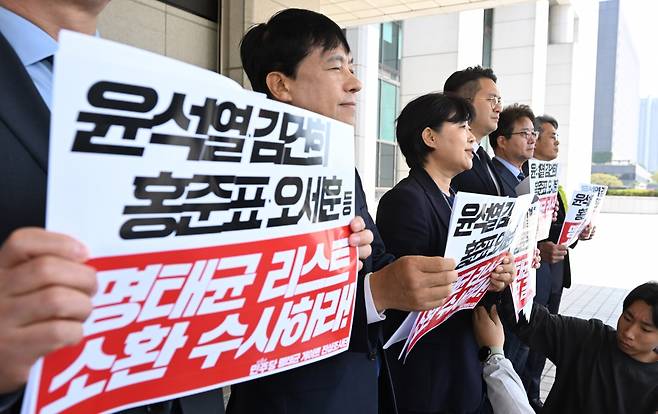 더불어민주당 '명태균 게이트 진상조사단' 서영교 단장을 비롯한 의원들이 28일 서울 서초구 대검찰청을 항의 방문하고 있다.