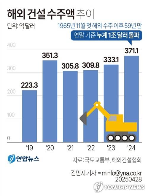 (서울=연합뉴스) 김민지 기자 = 28일 국토교통부와 해외건설협회에 따르면 해외건설 누적 수주액은 지난해 말 기준으로 1조 달러를 넘었다.