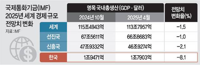 트럼프 대통령의 관세 타격에 따른 경제 규모 축소는 선진국과 신흥국 모두에 나타났다. 올해 선진국 경제 규모는 지난해 10월 전망 당시 67조5611억 달러에서 올해 4월 전망에서는 66조8683억 달러로 1.0% 축소됐다. 신흥국 올해 경제 규모는 같은 기간 47조9332억 달러에서 46조9274억 달러로 2.1% 줄어들었다. 이 기간 한국의 올해 경제 규모 전망치는 1조9471억 달러에서 1조7903억 달러로 감소율이 8.1%에 달했다. 이는 올해 줄어든 세계 경제 규모 전망치의 9.2%에 달하는 액수다. 트럼프 대통령의 관세 등으로 높아진 국제 통상 파고를 한국이 정면으로 맞는 것으로 분석된 것이다.