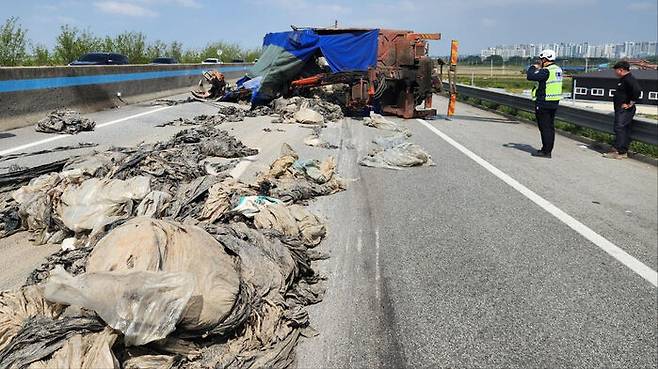 폐비닐이 우르르…익산장수고속도로서 5t 차 전도로 통행 차단