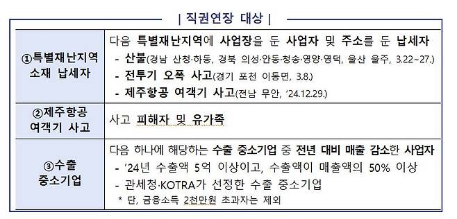 경상도 산불 등 특별재난지역 소재 납세자, 제주항공 사고 피해자 및 유가족 등 14만 명은 종합소득세 납부기한이 9월 1일까지로 직권 연장된다. 이는 별도로 신청하지 않아도, 납세 담보가 없어도 가능하다.
