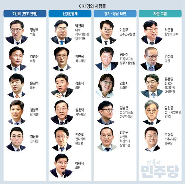 경기·성남 라인인 김남준 전 당대표실 정무부실장과 김현지 보좌관은 이 후보가 성남시장 시절부터 호흡을 맞춰온 복심이다. 정진상 전 당대표실 정무조정실장도 막후에서 영향력을 행사하는 것으로 알려졌다. 경기연구원장 출신인 이한주 민주연구원장은 이 후보의 ‘정책 멘토’다. 전문가·자문 그룹은 하준경 한양대 경제학부 교수, 주러시아 대사를 지낸 위성락 의원, 유종일 전 한국개발연구원(KDI) 국제정책대학원장 등이 있다.
