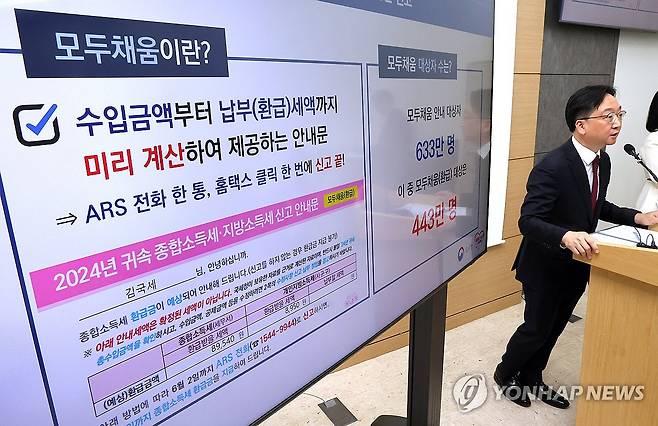 (세종=연합뉴스) 배재만 기자 = 국세청 심욱기 개인납세국장이 28일 정부세종청사 국세청 기자실에서 2024 귀속 종합소득세 확정신고에 관한 설명을 하고 있다. 이번 종합소득세 신고는 세무서 방문 없이 홈택스, 손택스, ARS 전화를 이용해 쉽게 신고할 수 있고 수입금액부터 세액까지 미리 계산해 안내 하는 모두채움 안내문을 633만 명에게 보내고 이 중 환급금이 발생하는 443만 명에게는 모두채움(환급) 안내문을 발송하는 등 더욱 친절한 서비스가 제공된다. 2025.4.28