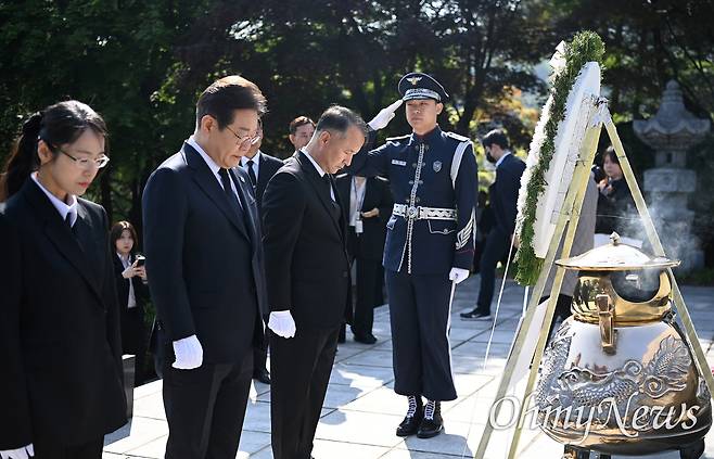 | ▲ 이재명 더불어민주당 대선 후보가 28일 오전 서울 동작구 국립서울현충원 고 이승만 전 대통령 묘역을 찾아 참배하고 있다. |