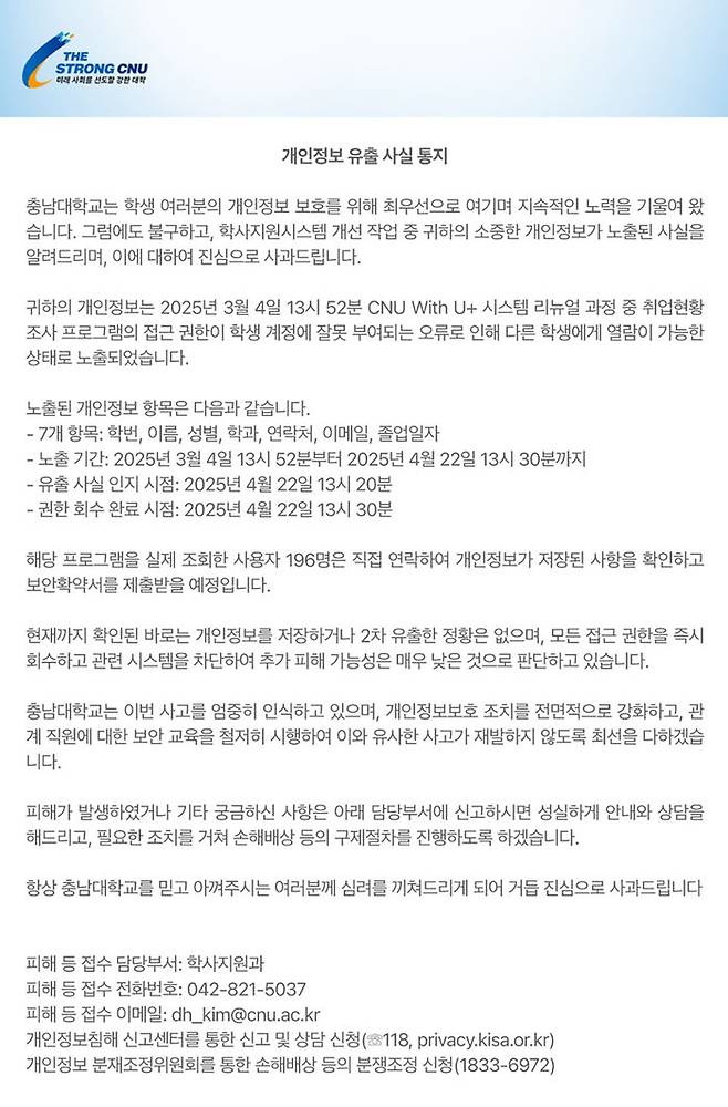 충남대는 이런 내용에 대한 개인정보 유출 사실을 통지하면서 "프로그램 실제 조회 사용자 196명에게 직접 연락해 보안 확약서를 받을 예정이고, 관련 시스템을 차단해 추가 피해 가능성은 낮은 것으로 보고 있다"며 "이번 사고를 엄중히 인식, 개인정보 보호 조치를 강화해 유사 사고가 재발하지 않도록 하겠다"고 말했습니다.