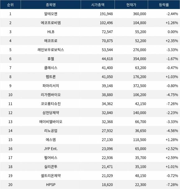 한국거래소에 따르면, 시가총액 1위인 알테오젠(196170)은 현재가 36만 원으로 전 거래일 대비 2.44% 하락하고 있다.