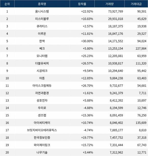 한편 거래량 상위 20위권 종목들은 아이스크림에듀(289010) ▲26.70%, 자연과환경(043910) ▲1.61%, 성호전자(043260) ▲5.88%, 우리로(046970) ▼4.88%, 샌즈랩(411080) ▲15.36%, 아이씨티케이(456010) ▲10.74%, 브릿지바이오테라퓨틱스(288330) ▼4.74%, 한국정보인증(053300) ▲19.77%, 와이제이링크(209640) ▲15.72%, 나무기술(242040) ▲3.44% 등의 성적을 기록하고 있다.