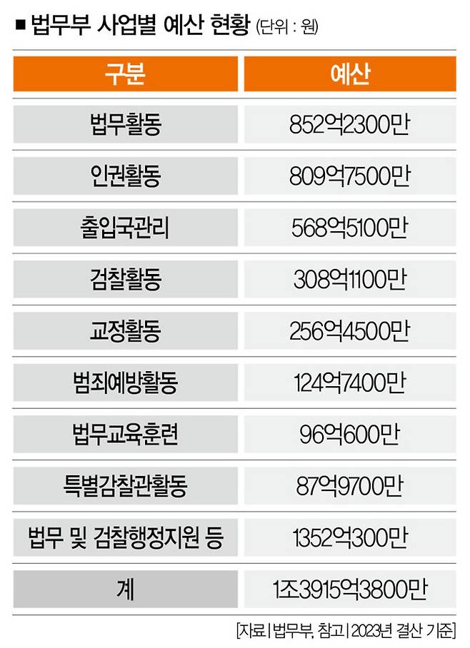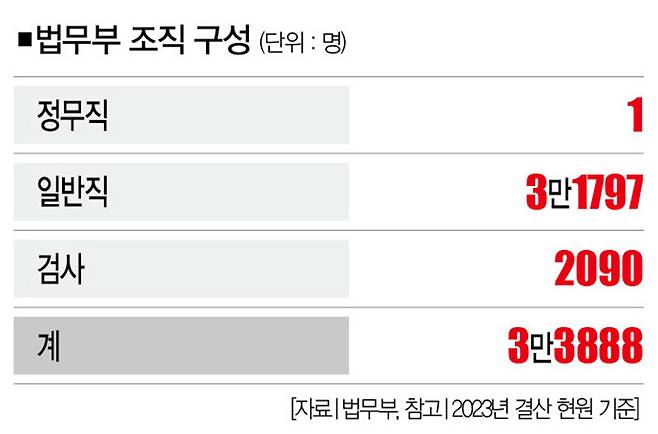 이는 법무부의 조직 구성을 보면 쉽게 확인할 수 있다. 2023년 기준 법무부 인원은 총 3만3888명이었다. 이 중 검사는 2090명에 불과하다. 나머지는 대부분 일반직 공무원이다.