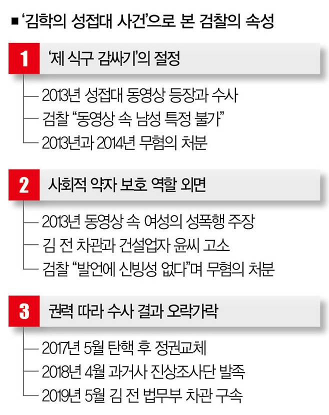 # 검찰은 국민의 세금으로 운영되는 조직이다. 당연히 국민을 위해 존재해야 한다. 여기서 국민이란 특정 권력자를 지칭하지 않는다. 하지만 검찰은 권력자를 좇기 바빴고, 국민은 뒷전이었다. 돈도 배경도 없는 사람은 쥐잡듯 잡으면서도 '검사 출신 선배들' 앞에선 꼬리를 내리기 일쑤였다. '김학의 성접대 사건'은 이를 잘 보여주는 사례다.