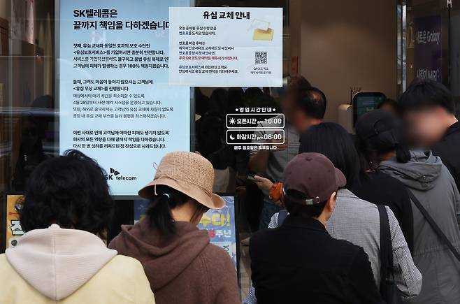 | ▲ 가입자 유심(USIM) 정보를 탈취당한 SK텔레콤이 유심 무료교체 서비스를 시작한 28일 서울 시내 한 SKT 대리점에서 시민들이 유심 교체를 위해 줄을 서 차례를 기다리고 있다. |