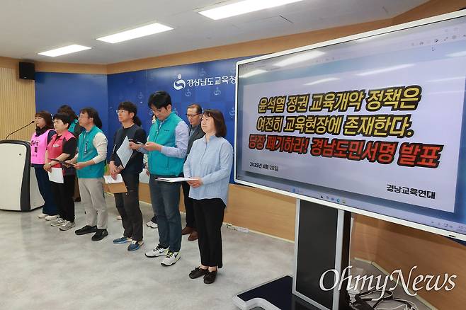 경남교육연대는 27개 단체와 개인 1981명이 참여한 가운데, 28일 경남도교육청 브리핑실에서 "경남도민의 외침이다. 윤석열 정권의 교육개악정책 당장 폐기하라"라고 선언했다.