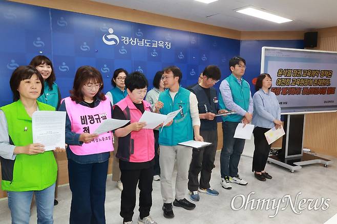 경남교육연대 등 단체·개인은 회견문을 통해 "지난 123일간의 광장 투쟁은 대통령 파면과 함께 사회대개혁을 향한 시민들의 열망이었다. 시민들의 목소리로 윤석열 대통령은 파면되었다"라며 "그러나 교육 현장에서는 여전히 윤석열의 유산이 독버섯처럼 자라나고 있다. 소통 없는 독단, 현장을 무시한 졸속 정책, 교육보다 경제논리를 동원한 교육개악정책은 지금도 추진되고 있고 고스란히 교사와 학생들이 그 결과를 감당하고 있다"라고 했다.
