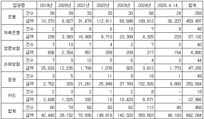 [표] 2019년~2025년 4월까지 연도별 국내 금융권 금융사고 발생 현황