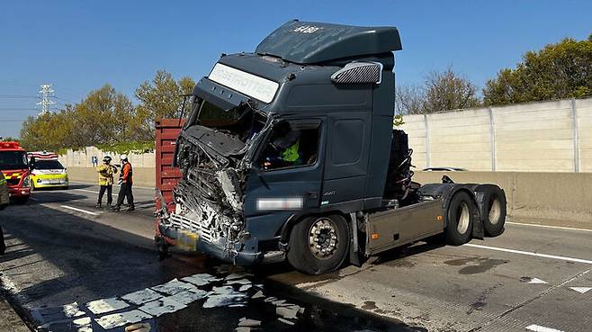 오늘(28일) 오전 8시 5분 충남 서산시 서해안고속도로 서울 방향 서산 나들목 인근을 달리던 25t 트레일러가 보호난간을 들이받으면서 적재함이 떨어져 일대에 정체가 빚어졌습니다.