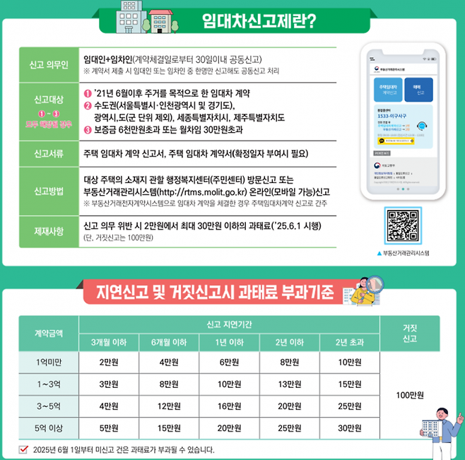 하지만 지난해 임대차 계약 신고율이 95.8%까지 올라간 데다 부동산거래관리시스템(RTMS) 고도화와 모바일 신고 기능 도입으로 제도적 기반이 갖춰졌다고 판단해, 6월 1일부터 과태료 부과에 나서기로 했다.