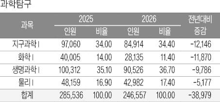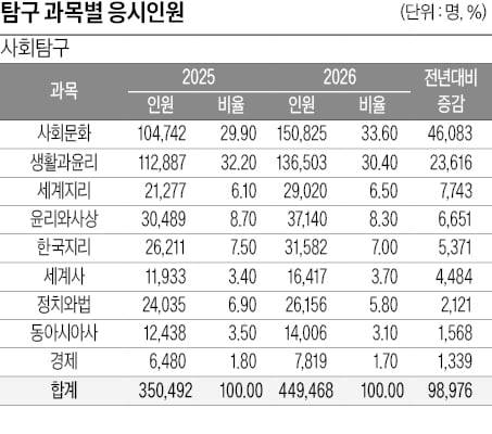 탐구 과목에서도 문과생 증가는 확인된다. 탐구 과목에서 올해 사탐 응시자는 64.6%로, 지난해 55.1%와 비교해 높은 증가세를 보였다. 2022학년도 통합 수능 도입 이래 최고 수치를 기록했다. 사탐 과목 중 사회문화는 지난해보다 4만6083명이 늘었고, 생활과 윤리는 2만3616명, 세계지리는 7743명이 증가하는 등 9개 과목 모두에서 지난해보다 응시생이 늘어났다. 반면 과탐 응시 비율은 지난해 44.9%에서 올해 35.4%로 큰 폭 하락했다.