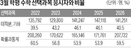 구체적으로, 3월 학력평가 기준으로 수학 과목에서 이과생이 주로 응시하는 미적분, 기하 응시 비율은 지난해 46.1%에서 올해 40.5%로 5.6%포인트 하락했다. 미적분, 기하 응시 비율은 2022학년도 통합 수능이 도입된 이래 꾸준히 증가해왔다. 응시 비율은 2022학년도 39.5%, 2023학년도 43.2%, 2024학년도 46.1%, 2025학년도 46.1%로 최고치를 기록했다. 2026학년도 40.5%로 크게 하락했다. 반면 문과 학생들이 주로 응시하는 확률과통계는 지난해 53.9%에서 올해 59.5%로 5.6%포인트 상승했다.