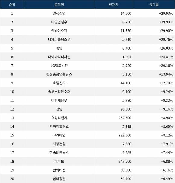 6위 다이나믹디자인(145210)은 종가 1,001원으로 24.81% 상승 마감했다. 7위 LG헬로비전(037560)은 종가 2,920원으로 20.16% 상승 마감했다. 8위 한진중공업홀딩스(003480)는 종가 5,150원으로 13.94% 상승 마감했다. 9위 호텔신라(008770)는 종가 44,100원으로 12.79% 상승 마감했다. 10위 솔루스첨단소재(336370)는 종가 9,100원으로 9.24% 상승 마감했다.