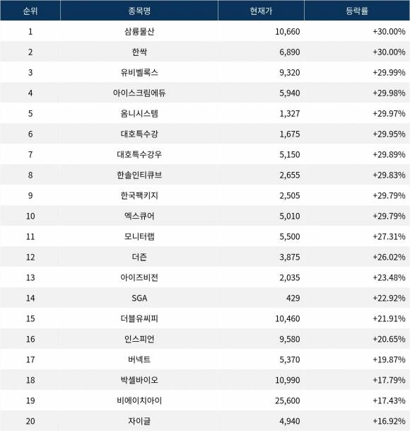 6위 대호특수강(021040)은 종가 1,675원으로 29.95% 상승 마감했다. 7위 대호특수강우(021045)는 종가 5,150원으로 29.89% 상승 마감했다. 8위 한솔인티큐브(070590)는 종가 2,655원으로 29.83% 상승 마감했다. 9위 한국팩키지(037230)는 종가 2,505원으로 29.79% 상승 마감했다. 10위 엑스큐어(070300)는 종가 5,010원으로 29.79% 상승 마감했다.