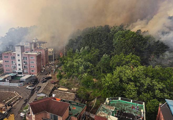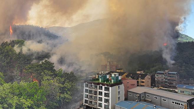 산불이 발생한 곳에서 직선거리로 2km 거리 이내에 조야동에는 민가가 있어 주택 피해 우려도 커지고 있습니다.