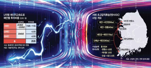 28일 서울경제신문이 입수한 ‘대한민국 신성장 동력 확보 정책 제안서’에 따르면 수송 능력 총 8GW 규모의 ‘서해 남북 종단 초고압직류송전(HVDC)’ 사업의 투자 금액은 11조 원 규모로 추정됐다. 이는 2년 전인 2023년 산업통상자원부와 한전이 예상한 7조 9000억 원보다 39.2% 증가한 규모다. 글로벌 전력 수급난에 변환기 등 핵심 기자재가 품귀 현상을 빚으면서 건설 비용이 급등한 영향이다. 아직 경과지가 확정되지 않은 남해안과 동해안 에너지 고속도로는 투자액의 변동 가능성이 크지만 각각 최소 4조 5000억 원을 투입해야 하는 것으로 추산됐다. 이 제안서는 국내 전력 업계가 민주당에 직접 전달한 정책 보고서다.