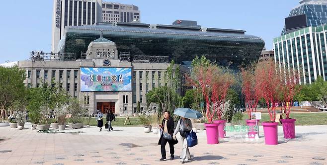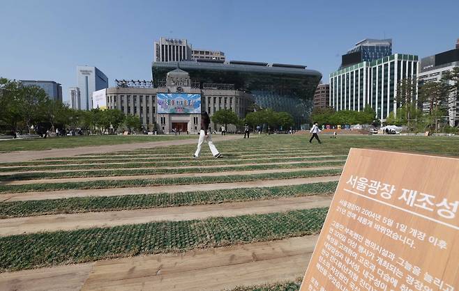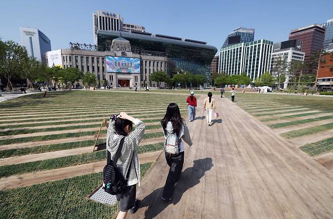 28일 서울시청 앞 서울광장을 찾은 시민들이 21년 만에 새 단장한 서울광장을 걷고 있다. 서울시는 숲과 정원의 개념을 더해 문화·예술·여가·자연을 동시에 즐길 수 있는 새로운 서울광장을 이날 1차 공개했다.