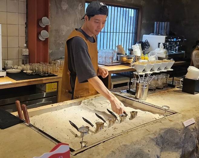 영상 속 이동건은 앞치마를 입은 채 여느 카페 사장과 다름없이 영업에 열중하는 모습이다.