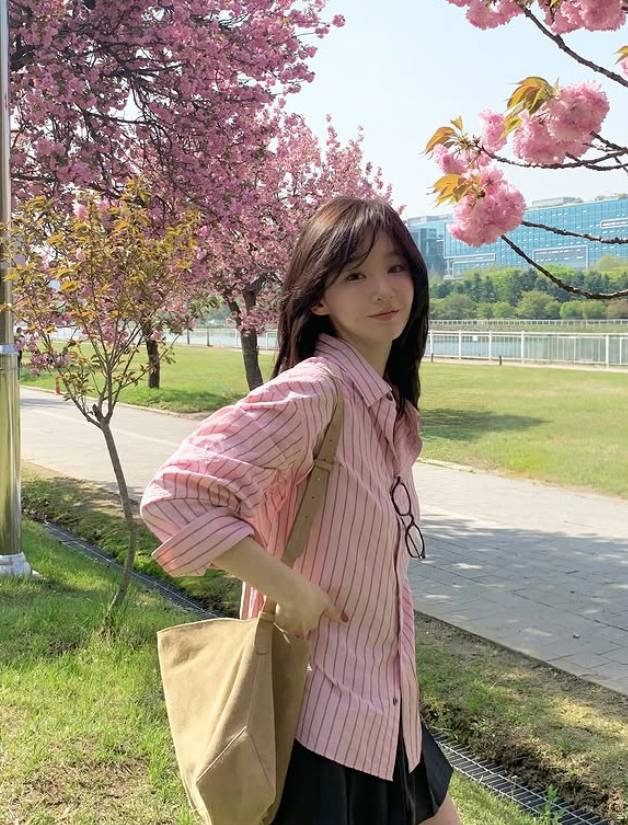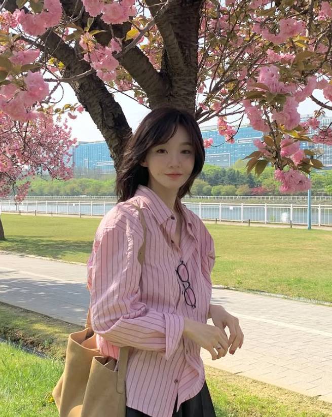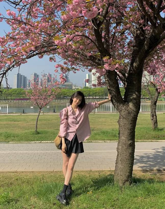 공개된 사진 속 강민경은 활짝 핀 겹벚꽃 나무 아래에서 포즈를 취하고 있다.
