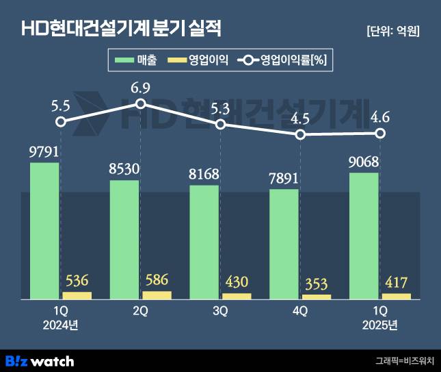 지난 24일 실적을 발표한 HD현대인프라코어도 처지는 비슷하다. 지난 1분기 매출은 1조185억원으로 전년동기대비 12%, 영업이익은 678억원으로 전년동기대비 26.9% 각각 줄었다.
