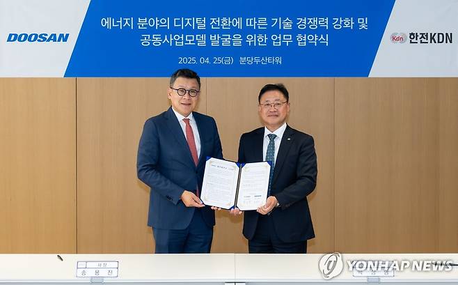 (서울=연합뉴스) 송용진 두산에너빌리티 전략·혁신부문장(왼쪽)과 박상형 한전KDN 사장이 지난 25일 경기 성남시 분당두산타워에서 열린 '에너지 분야 디지털 전환에 따른 기술 경쟁력 강화 및 공동사업 모델 발굴' 업무협약식에서 기념 촬영하고 있다. 2025.4.28 [두산에너빌리티 제공. 재판매 및 DB 금지]