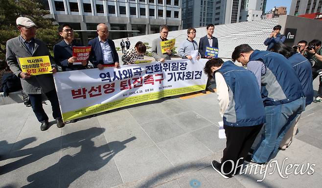 | ▲ 진화위 직원들의 사과 "진화위 박선영 위원장 사퇴하라!" (사)오월어머니집, (사)5·18서울기념사업회, 민족문제연구소 등 27개 단체 주최로 28일 오후 서울 중구 진실·화해를위한과거사정리위원회 앞에서 열린 박선영 진화위원장 퇴진 촉구 기자회견에서 공무원노조 진실화해위원회 지부장 등이 "박선영 위원장의 역사적 인식이 극우유투버 수준이라고 판단하고 자격없는 위원장은 즉각 사퇴할 것을 촉구했다"며 "소속 직원으로서 부끄럽고 참담한 심정"이라고 밝힌 뒤 5.18 영령과 피해자, 유족, 국민여러분께 사과의 말씀을 드린다고 고개 숙이고 있다. |