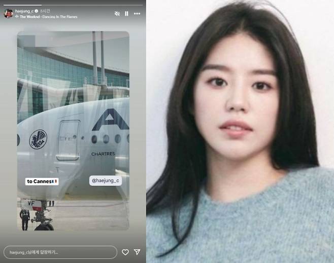 조혜정은 28일 개인 계정에 비행기 사진을 올렸다. 여기에 'to Cannes'라는 문구도 적혔다. 해당 사진은 조혜정 지인이 올린 것을 재업로드한 것으로 보인다.