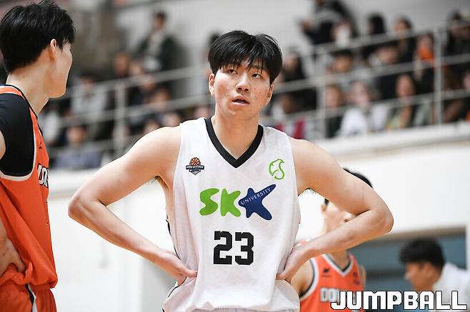 [점프볼=필동/유용우 기자] 28일 동국대 서울캠퍼스 체육관에서 열린 2025 KUSF 대학농구 U-리그 동국대와 성균관대의 경기, 성균관대 구민교가 숨을 몰아쉬고 있다.