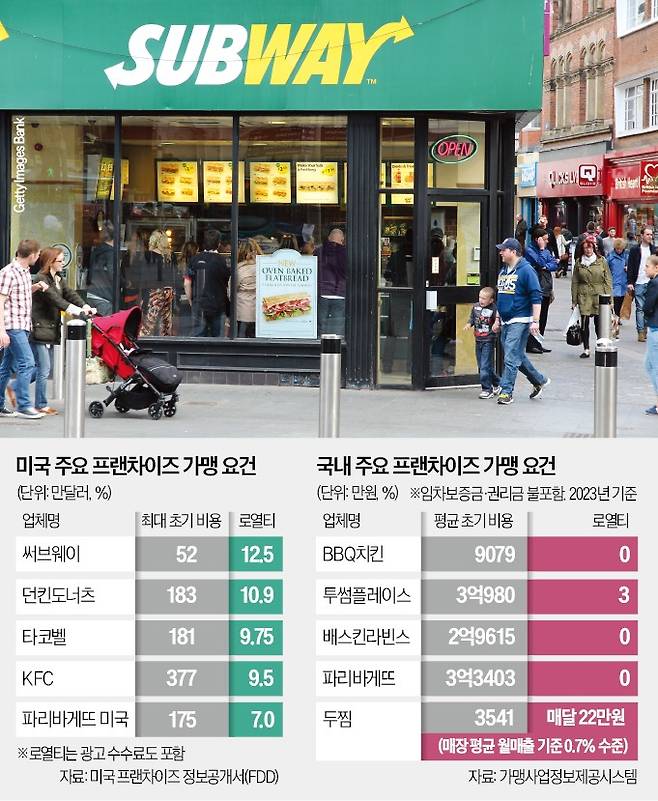 세계 매장 수 1위 글로벌 프랜차이즈 브랜드 써브웨이의 창업 비용은 7억5000만원이다. 국내에서 써브웨이 매장을 낸다면 초기 창업 비용이 1년 월세를 포함해 최대 7억9040만원이다. 가맹비, 교육비, 인테리어비, 주방 장비 등에 드는 비용이다. 로열티는 미국과 같은 총 12.5%(부가가치세 포함 13.75%)다. 한국 프랜차이즈의 창업 비용이 1억~3억원대임을 고려하면 높은 편이다. 그 대신 본사는 차액가맹금으로 이익을 남기지 않는다. 써브웨이는 1996년부터 가맹점주들이 만든 비영리 법인인 ‘IPC’(독립구매협동조합)를 통해 식자재를 마진 없이 공급하고 있다.