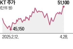 이날뿐만이 아니다. KT 주가는 올 들어 17% 오르며 순항하고 있다. 평소 주가 등락이 심하지 않은 대형 통신주인 점을 감안하면 상승폭이 큰 편이다. 외국인 지분 취득 한도를 꽉 채운 상황에서도 우상향하고 있다. 지난해 KT 주식을 대거 사들인 외국인의 매수가 끊겼지만 기관이 이달 들어 127억원어치 순매수했다. SK텔레콤과 LG유플러스의 외국인 한도 소진율은 각각 87.7%, 72.5%로 아직 여유가 있다.