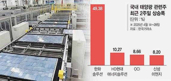 28일 한국거래소에 따르면 최근 2주일(4월 14일~4월 28일)간 한화솔루션은 49.38% 상승했다. 이 밖에도 태양광 관련주인 HD현대에너지솔루션, 신성이엔지, OCI도 각각 같은 기간 10.27%, 8.2%, 8.66% 올랐다.