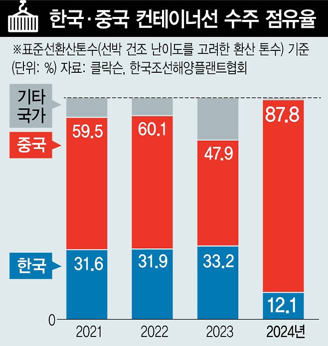 전세계 컨테이너선 시장은 중국 조선소들이 가격 경쟁력을 앞세워 빠르게 점유율을 늘려왔다. 한국조선해양플랜트협회 통계를 보면, 중국의 컨테이너선 수주 점유율(선박 건조 난이도를 고려한 표준선환산톤수 기준)은 2021~2024년 59.5%에서 87.8%로 확대됐다. 같은 기간 한국의 점유율은 31.6%에서 12.1%로 쪼그라들었다.