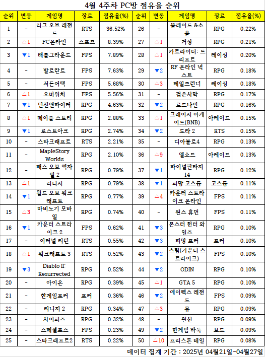 한 주간의 PC방 순위를 되짚어 보고, 어떤 변화가 있었는지 알아보는 'PC방순위' 코너입니다. 데일리게임은 매주 PC방 순위를 일목요연하게 정리, 독자들이 알아보기 쉽도록 제공합니다. 지난 한 주간 어떤 PC 온라인게임들이 눈길을 끌었는지 살펴봤습니다. < 편집자주 >