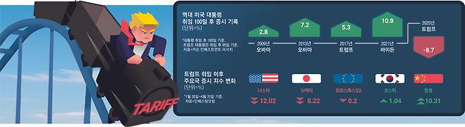 이는 1937년 프랭클린 루스벨트 대통령이 2기 임기 중 뉴딜 정책을 펼친 후 재정 긴축 여파로 100일 만에 기록한 9.3% 하락을 뒤이은 역대 5위 수준이다. 루스벨트 대통령 3기 당시 제2차 세계대전 확산 국면에서 나온 -10.3%(1941년), 리처드 닉슨 대통령 취임 초기 스태그플레이션 충격으로 발생한 -9.7%(1973년)와도 ‘한 끗’ 차이다.
