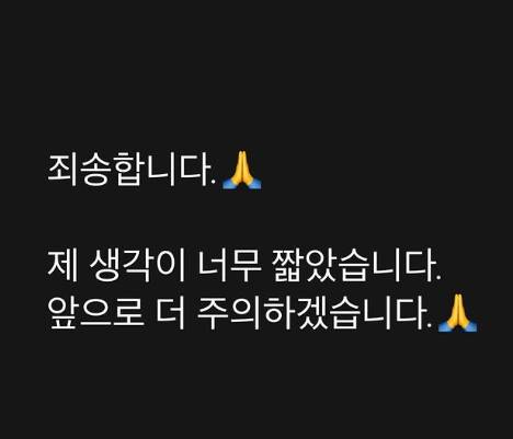이후 김나영은 SNS에 사과문을 게재하며 “죄송합니다. 제 생각이 너무 짧았습니다. 앞으로 더 주의하겠습니다”라고 사과했다.