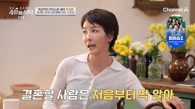 이날 진서연은 9살 연상 남편과의 러브스토리를 공개했다. "결혼할 상대가 어떻게 촉이 오냐면, 너무 사랑해서 이 사람이랑 결혼하면 좋을 것 같아서 결혼할 것 같지? 아니다. 처음부터 촉이 온다"고 운을 뗀 것.