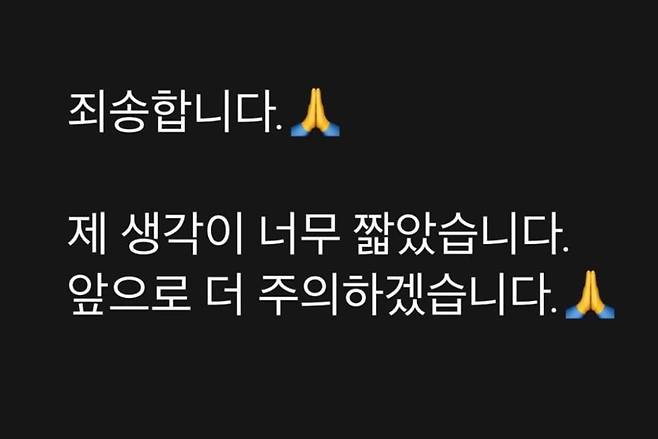 김나영은 28일 개인 소셜네트워크서비스(SNS)에 "죄송하다. 생각이 짧았다"며 "앞으로 주의하겠다"고 고개를 숙였다.