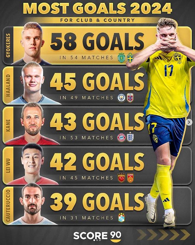 글로벌 축구매체 '스코어90'은 지난해 11월 사회관계망서비스(SNS)를 통해 "2024년 클럽과 국가대표팀 최다골 Top 15"을 발표했는데, 이때 요케레스가 클럽과 대표팀에서 무려 58골을 터트려 엘링 홀란(맨체스터 시티), 해리 케인(바이에른 뮌헨) 등을 제치고 1위에 올랐다.