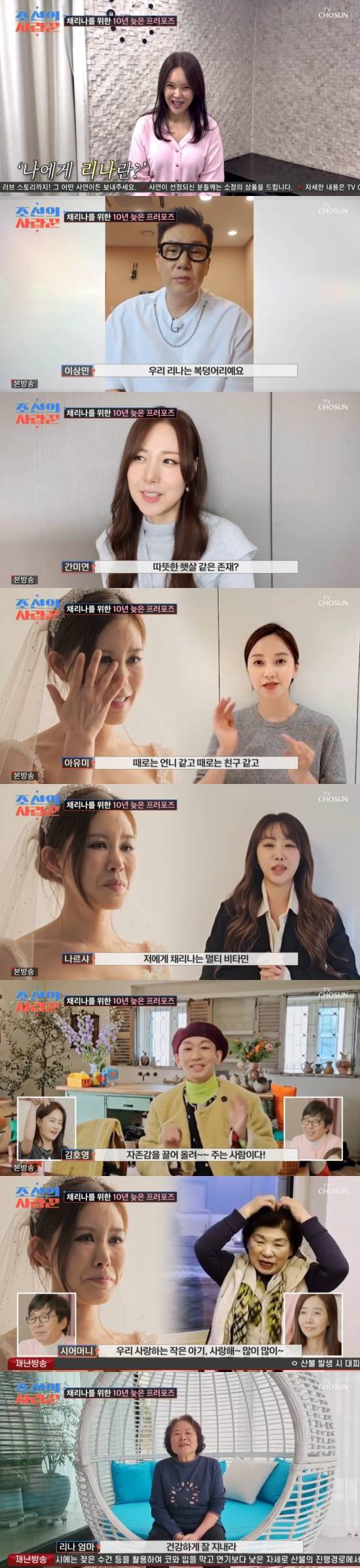 특히 박용근은 프러포즈 당일 김진과 민경의 도움을 받았고, 채리나에게 지인들에게 받은 영상 편지를 보여줬다. 백지영은 "저는 채리나의 언니 가수 백지영이라고 한다. 우리 리나는 저한테는 굉장히 따뜻한 마음이 따뜻한 동생인 것 같다. 이런저런 일이 많이 있었던 질풍노도의 시기에 소중한 추억으로 자리 잡고 있는 소중한 동생이다"라며 전했다.