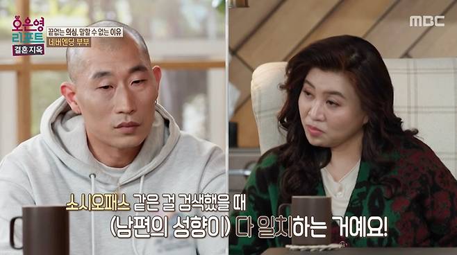 사연 신청을 직접 했다는 아내는 "(남편이) 다른 사람들 있을 때만 잘하는 척 한다. 남편의 성격이 일반적이지 않은 것 같다. 소시오패스 같은 걸 검색했을 때 (남편의 성향이) 다 일치하는 거다"고 털어놓았다.
