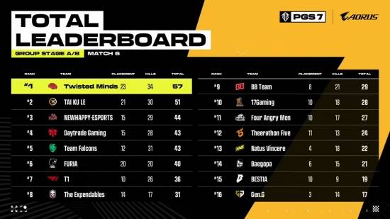 그룹 스테이지 A/B조 경기를 치른 결과, 트위스티드 마인즈 (TWIS)가 킬 포인트 34킬, 순위 점수 23점 도합 57점을 쌓으며 일찌 감치 'PGS 7' 파이널 진출을 사실상 확정헀다.