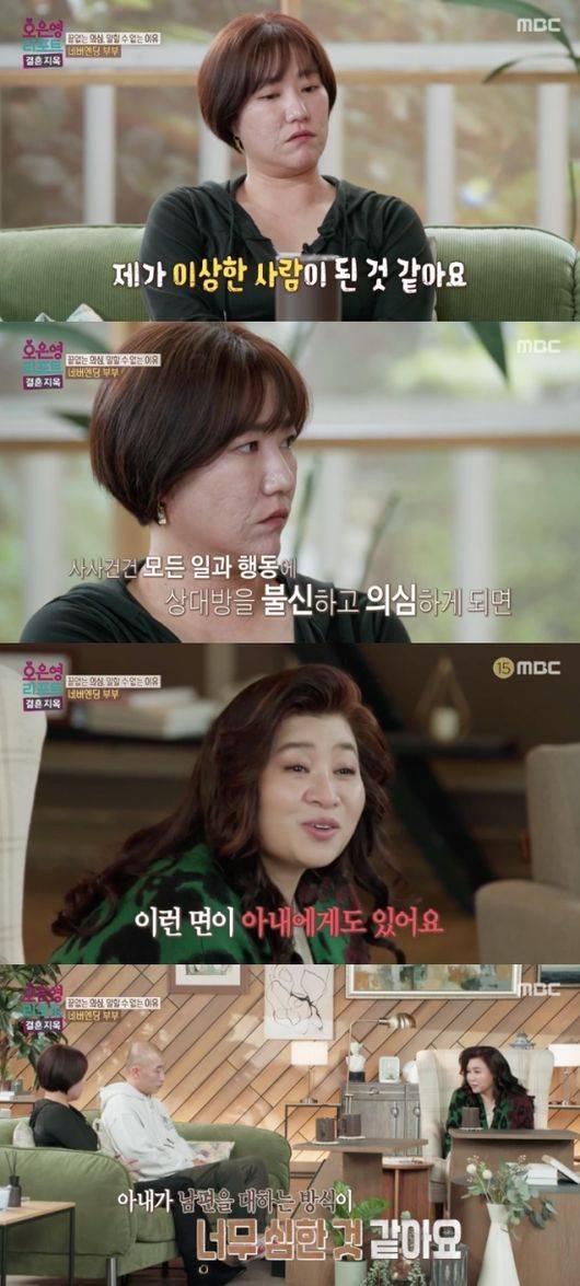 오은영은 계속 억울해하는 아내에게 “억울한 것도 있고 이런 면도 있는 것이다. 자기중심적인 면이 아내에게도 있다. 본인의 모습은 잘 못 보는 것 같다. 기본적으로 불신이 너무 크다. 남편이 노력하는 것에 의심을 하면 안 된다. 아내가 남편을 대하는 방식이 너무 심한 것 같다”라고 설명했다.