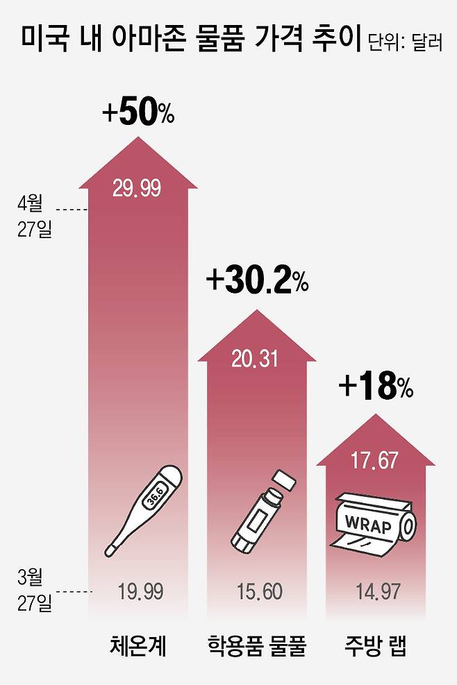 미국인들이 가장 많이 이용하는 세계 최대 온라인 쇼핑몰 아마존에선 요즘 제품 값이 올랐다는 알림 메시지가 계속 뜬다. 아마존은 이용자들이 관심 품목으로 저장한 상품의 가격이 오르거나 내릴 때마다 장바구니 알림을 보내주는데 도널드 트럼프 미국 대통령의 ‘관세 전쟁’이 시작된 뒤 ‘내렸다’는 알림은 사실상 사라졌다. 27일(현지 시간)에도 아마존 계정에선 다양한 품목의 가격 상승 알림 메시지가 떴다. 한 달 전 담아둔 주방 랩 가격은 14.97달러에서 17.67달러로 18%, 학용품인 물풀은 15.60달러에서 20.31달러로 30.2%, 체온계는 19.99달러에서 29.99달러로 50% 뛰었다. 모두 중국 등 해외에서 생산되는 제품이다.