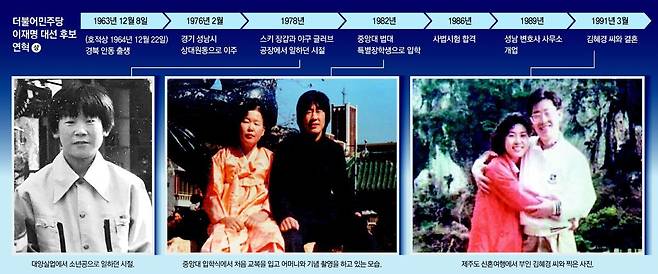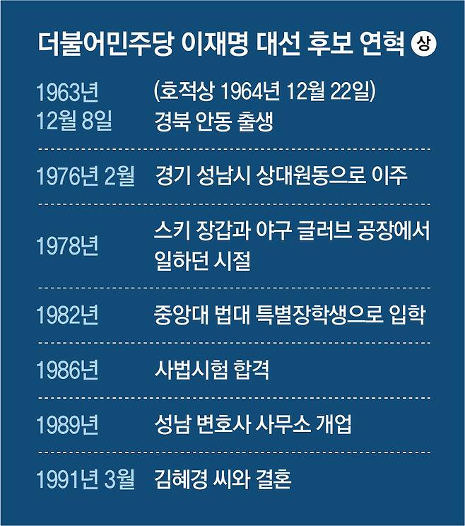 1976년 초교를 졸업한 직후 아버지가 정착한 경기 성남시 상대원동 꼭대기 월셋집으로 온 가족이 상경했다. 이후 이 후보는 6년간 목걸이 공장을 거쳐 고무부품 공장, 냉장고 공장 등을 전전했다. 아버지는 동네 쓰레기를 치웠고 어머니는 상대원시장 화장실 입구에서 소변 10원, 대변 20원의 이용료를 받고 청소를 했다. 아버지는 자식 공부보다 번듯한 집 한 채 마련이 우선인 사람이었다.